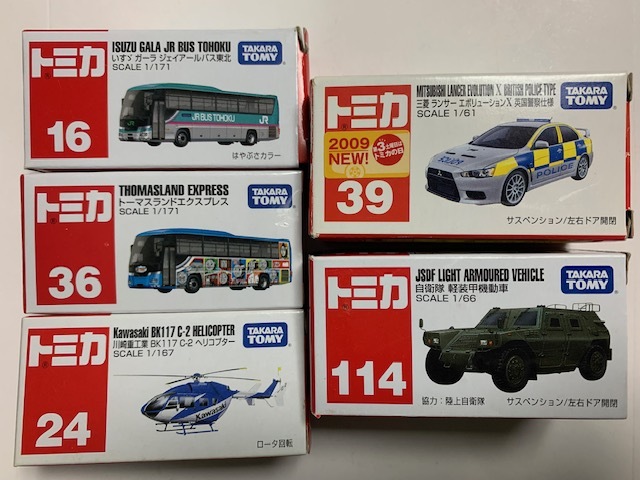 - 当時物 2014年頃 トミー トミカ 絶版品 働く日本車 5種セット いすゞJRバス トーマスランド ヘリコプター ランサー英国警察 軽装甲機動車