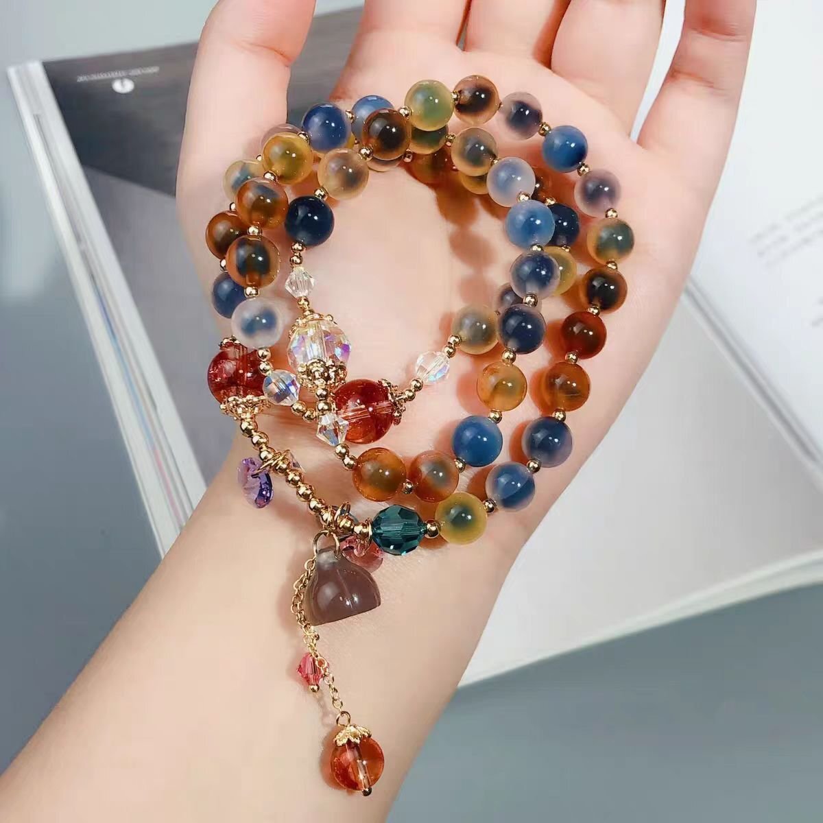 > **極美品**カラーブルーシュガーハート瑪瑙ブレスレットマイナーデザイン925純銀オーストリアクリスタルマルチリング招き手串