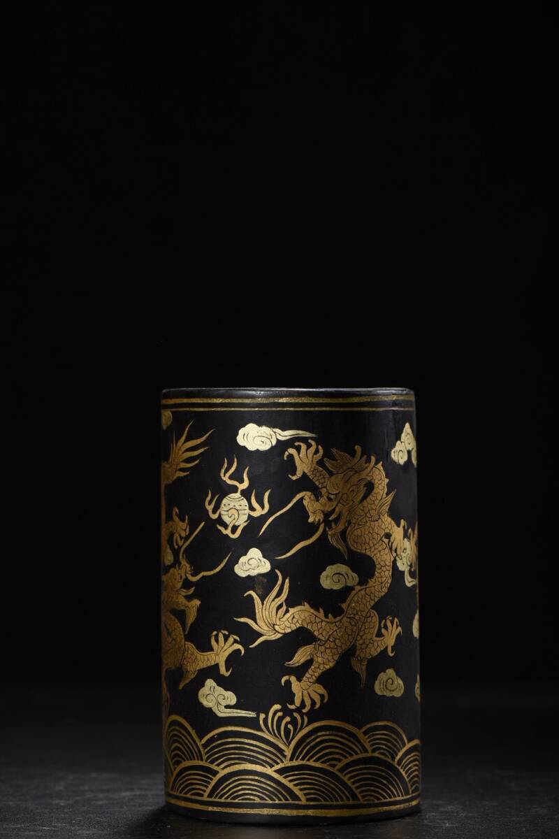 - ▽鴻▽ 木胎漆器彫 描真金 二龍戲珠紋 筆筒 置物 古賞物 中国古玩 中国古美術