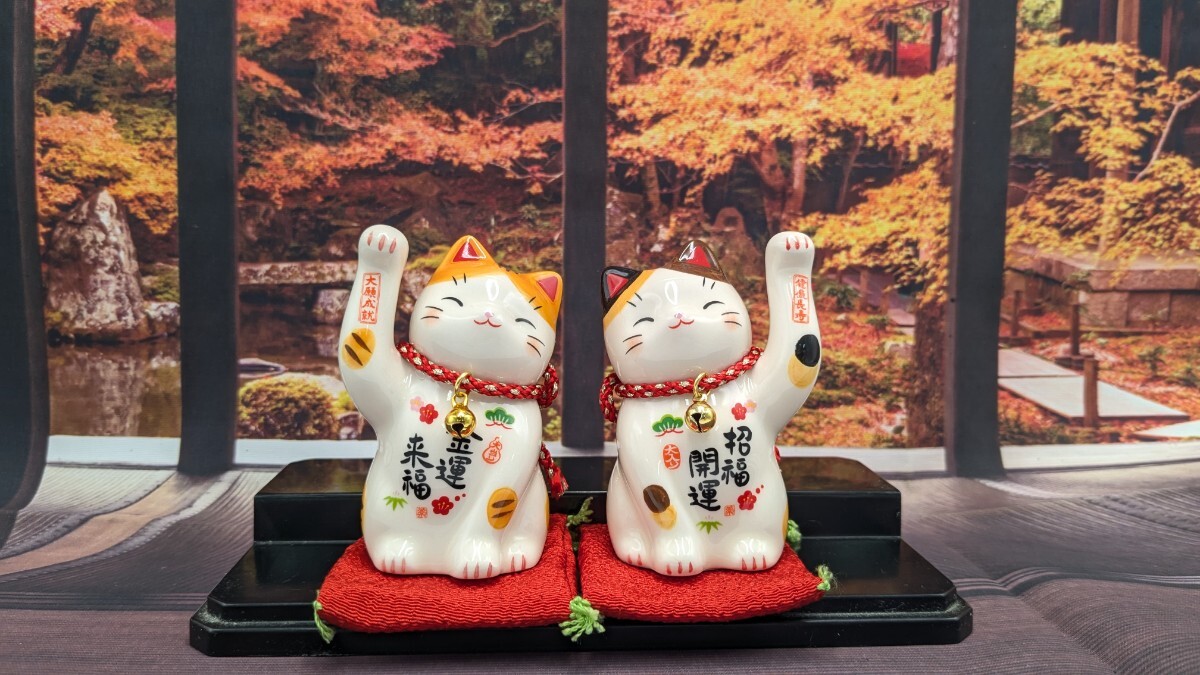 - 縁起物 招き猫 陶器 彩絵 招福開運招き猫 右手上げ 左手上げ 2種セット