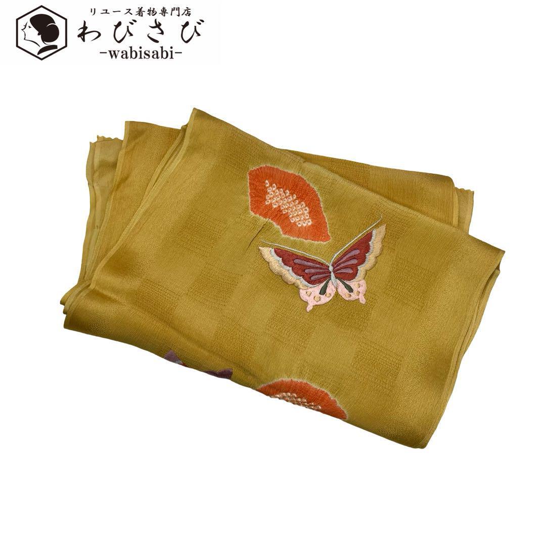 > 和装小物 帯揚げ 正絹 地紙の絞りに蝶々の刺繍 黄土色 C-5542 着物 きもの kimono 和服 和装 中古 リサイクル着物 【送料無料】
