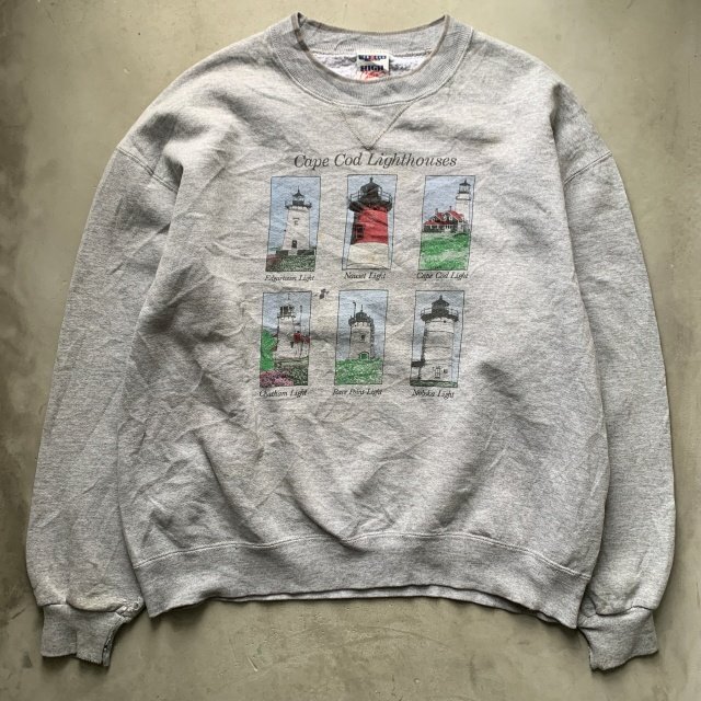 > 【L/XL】90s USA製 JERZEES 灯台 プリントスウェット 杢グレー■ビンテージ オールド アメリカ古着 前V ラッセル メランジ