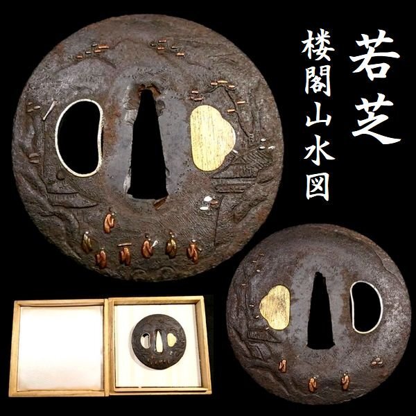 > 【 恵 #1547 】 「若芝」を彷彿とさせる一品 見栄え良き楼閣山水図 象嵌の綺麗な鉄地鍔 検:鍔/縁頭/切羽/ハバキ/刀剣/刀装具