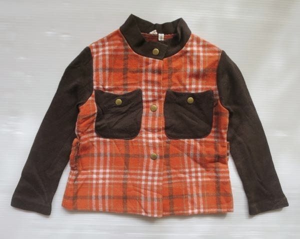 > ◆ キッズ UNKNOWN 長袖ウールシャツ ジャケット 80㎝程度 オレンジチェック×茶色/ビンテージ オールド ヨーロッパ古着 レトロ 子供服