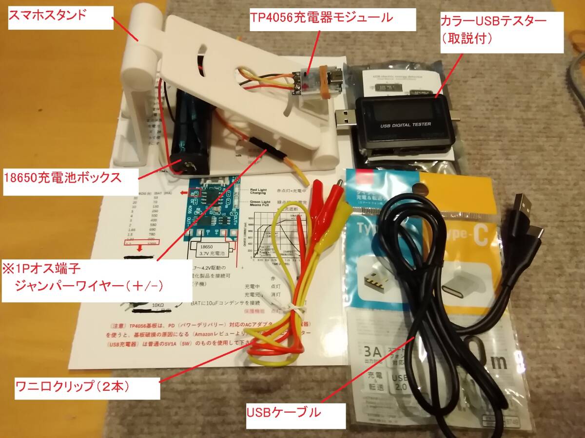 - 1 カラーUSBテスター付 スマホスタンド(白)型18650充電器(USB端子ケーブル & 18650充電池BOX & TP4056充電器モジュール付)