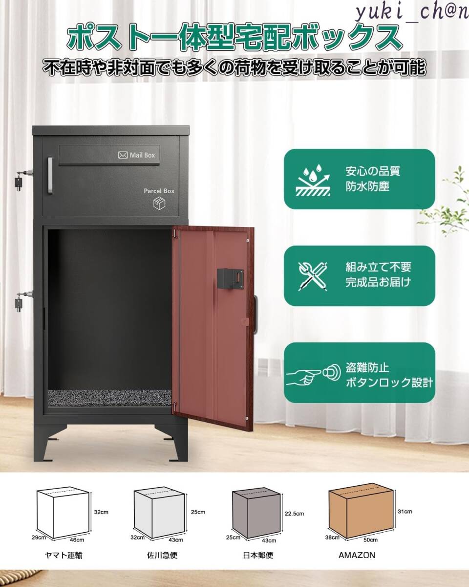- 宅配ボックス 大容量 自宅用 宅配BOX ポスト 組み立て不要 両開扉 簡単設置 防塵 一戸建て用 マンション 屋外 黒木目 メールボックス付