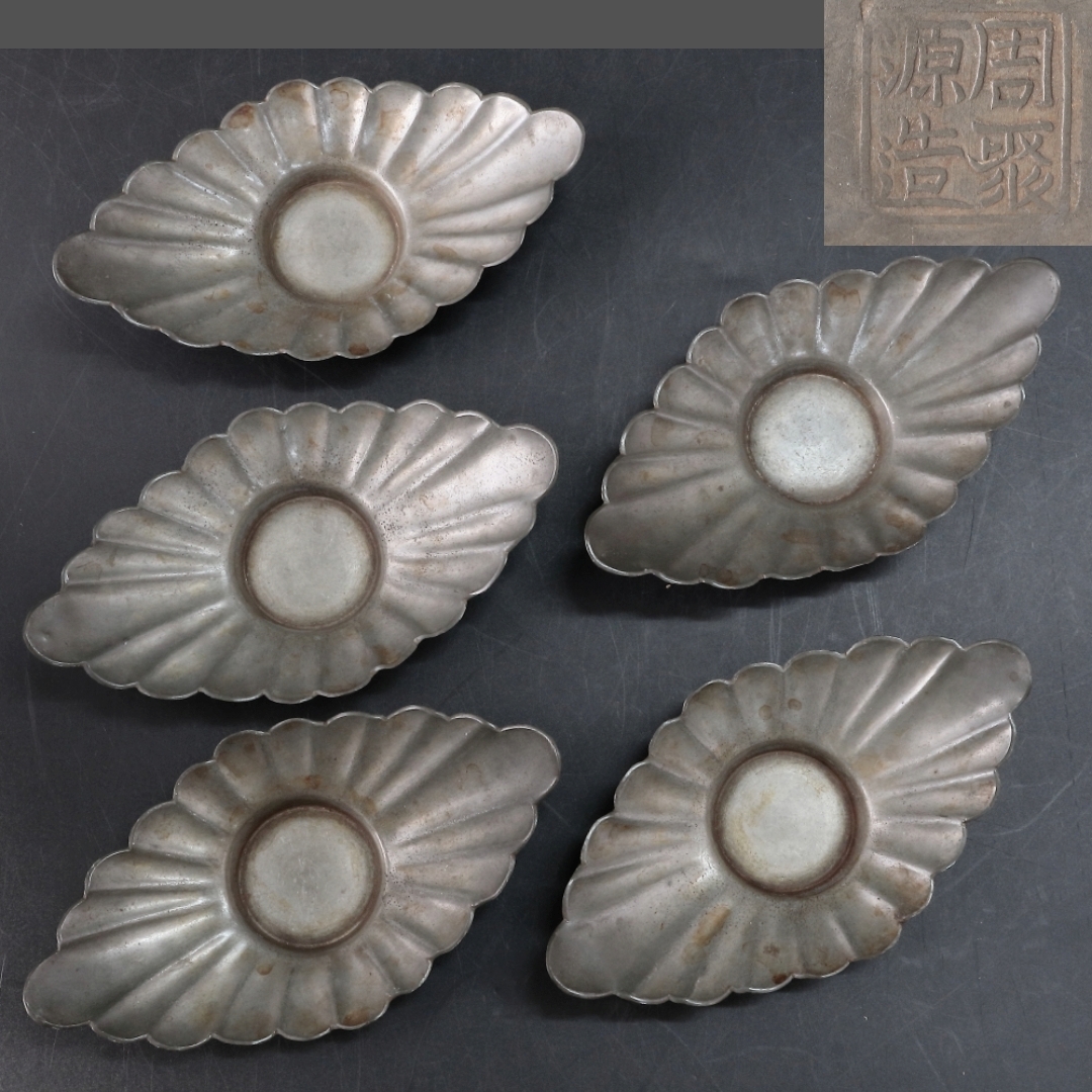 - ◆◇中国古玩 周聚源造 古錫茶托 五客 煎茶道具 唐物 煎茶器 時代◇◆