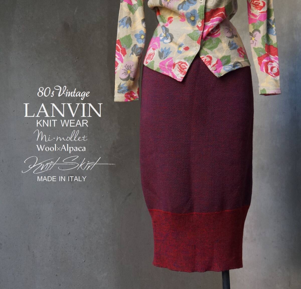 > 80s ヴィンテージ イタリー製 ランバン LANVIN Knit Wear 赤青ミックス ワイン ミモレ アルパカ混 ウール ニットスカート F W58-76 M相当