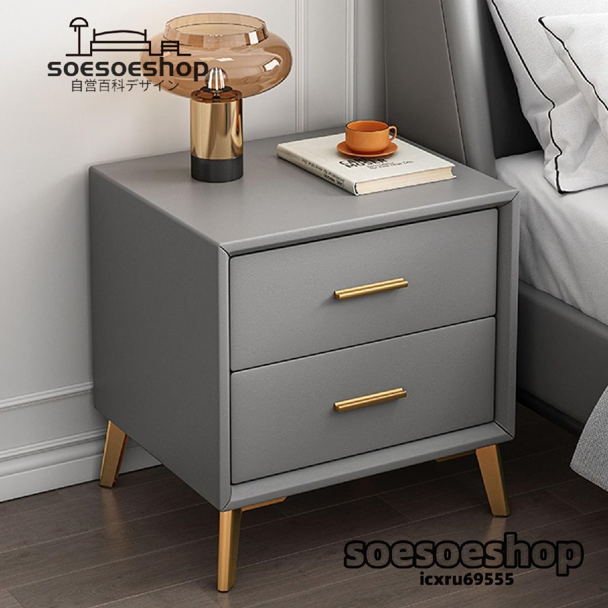 > 多機能 無垢材のサイドテーブル 2引き出し付き 革製ロッカー メンテナンス簡単モダン スタイル ベッドサイド 収納チェスト グレー