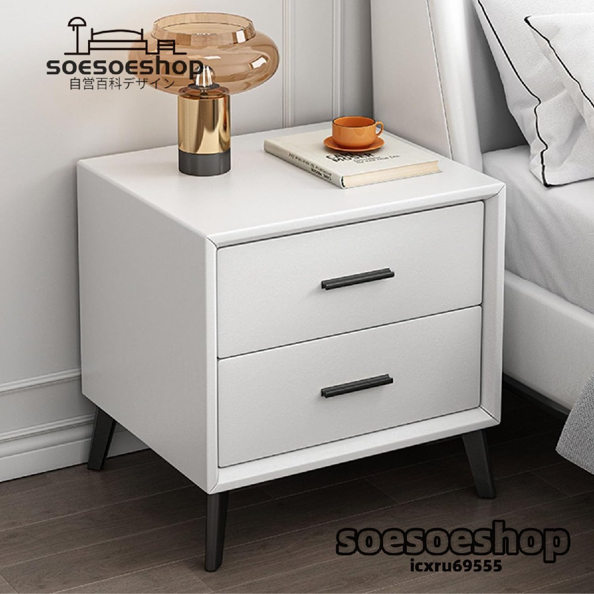 - 多機能 無垢材のサイドテーブル 2引き出し付き 革製ロッカー メンテナンス簡単モダン スタイル ベッドサイド 収納チェスト 白