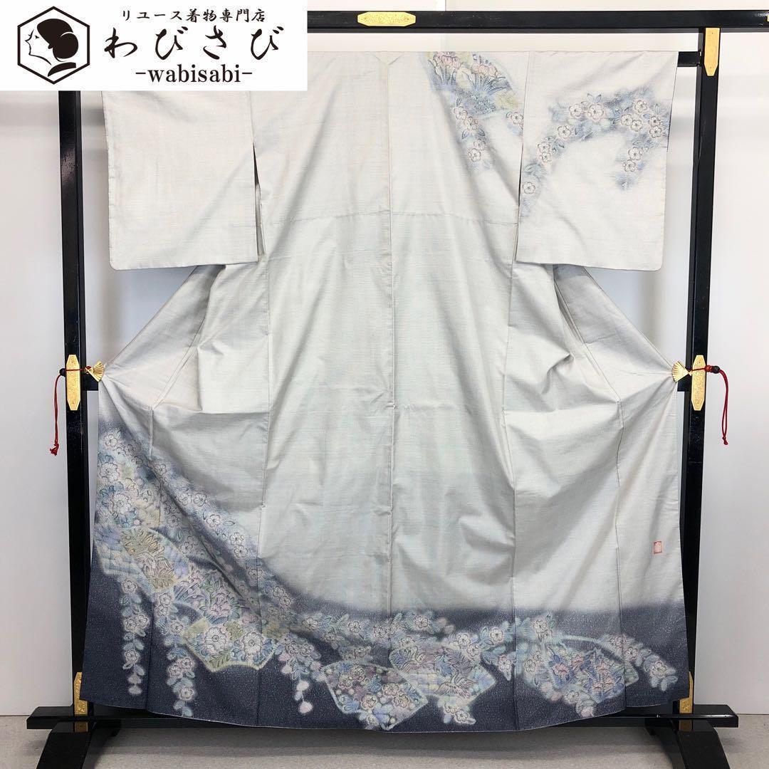 > 訪問着 染大島 作家物 美しい辻が花絞り 暈し染 雲井鼠色 K-3844 着物 きもの kimono 和服 和装 中古 リサイクル着物 【送料無料】