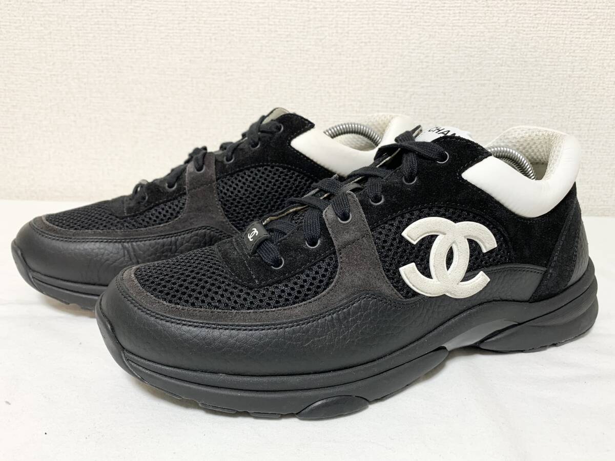 > 【正規品】極美品 シャネル CHANEL G38301 ココマーク CC スエード スウェード レザー メッシュ スニーカー メンズ シューズ 42 黒 白