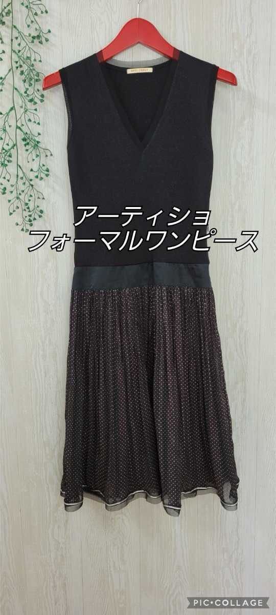> 美品 ARTI CHAUT アーティショ フォーマルドレス ワンピース M 黒 ブラック Vネック ラメニット ドットプリーツ シフォンスカート