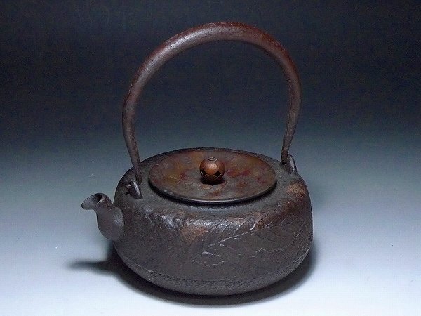 - 6013H13*3B▲煎茶道具・荒肌木の葉文鉄瓶・斑紫銅蓋・肩衝平丸形・急須・鉄器・茶器・骨董@