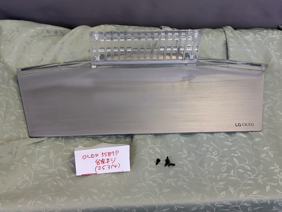 55インチから取り外した台座スタンドです。樹脂の刻印を見る感じですと65インチのモデルにも共通の可能性が高いですが、実際の取り付けは確認できていません。自己責任で利用ください。