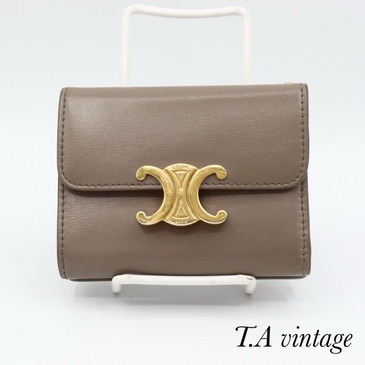 - CELINE 美品 セリーヌ カーフスキン トリオンフ コンパクト 折り財布 グレージュ