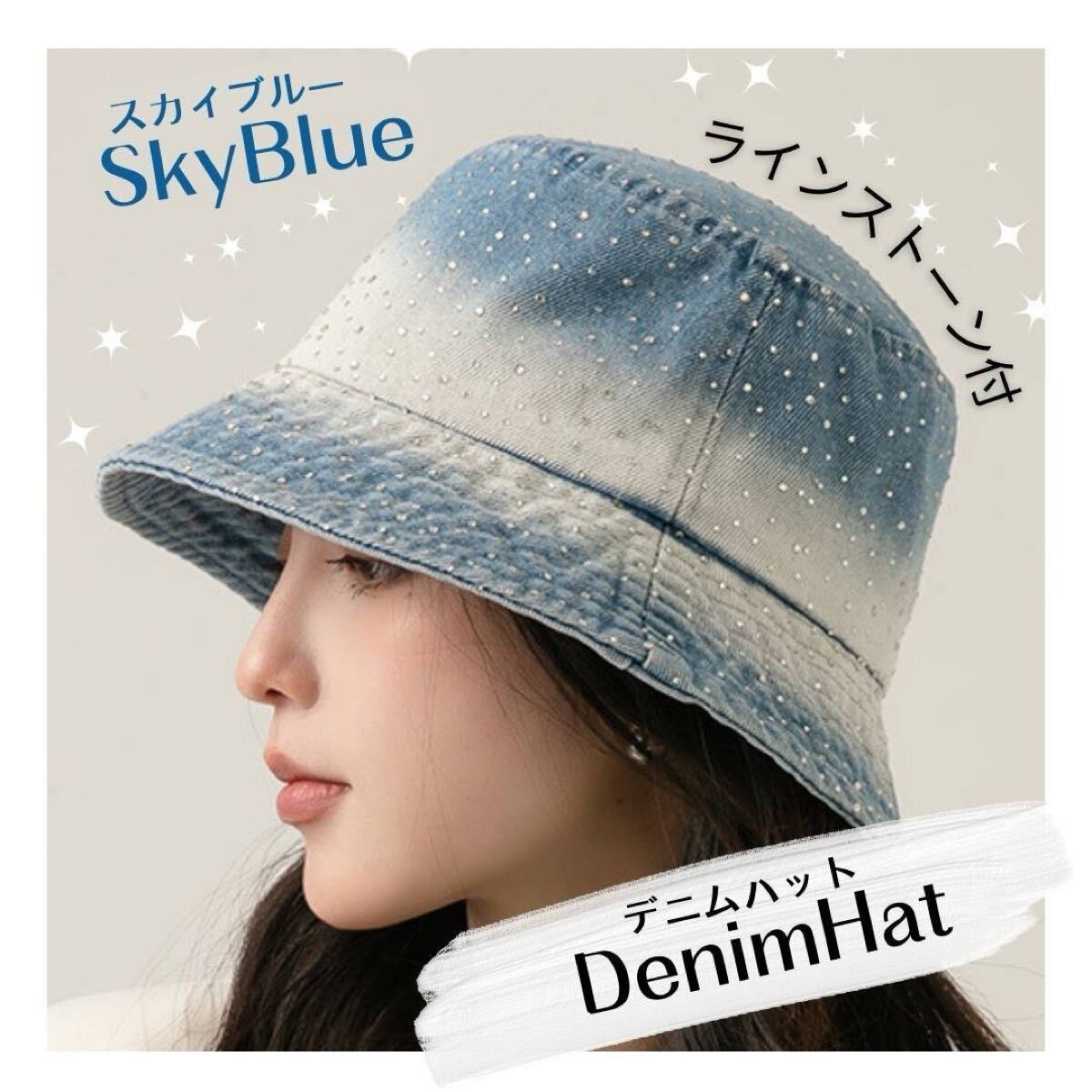 - デニムハット バケットハット バケハ スカイブルー ラインストーン ネイビー