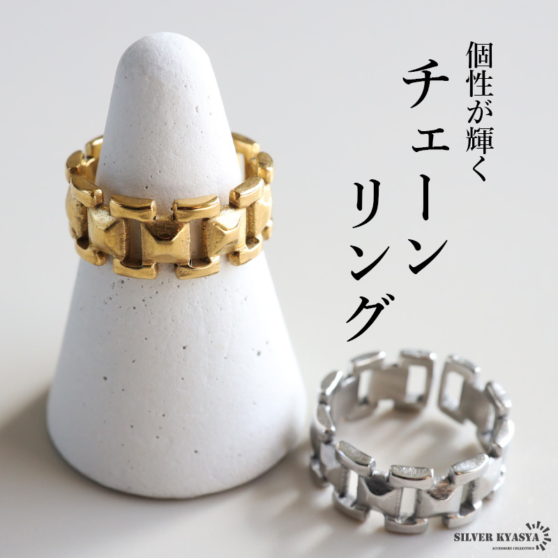 > (シルバー) ステンレス チェーンリング 幾何学リング スタッズ ゴールド 18K GP フリーサイズ 女性 金属アレルギー対応