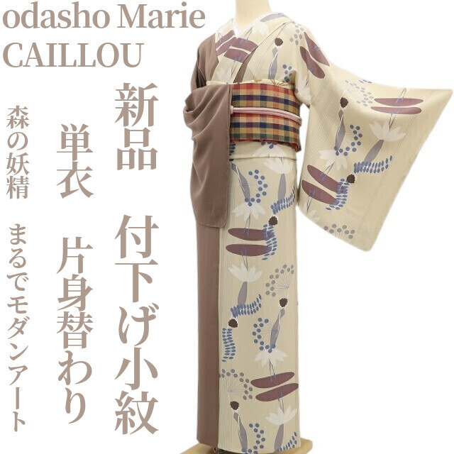 - tomihisa 新品 単衣 odasho Marie CAILLOU“森の妖精…まるでモダンアート”着物 正絹 仕付け糸付 片身替わり 付下げ小紋 5473