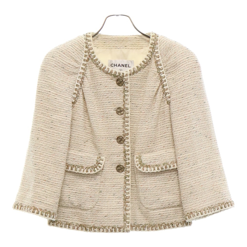 - CHANEL シャネル ココマークボタン ツイードノーカラージャケット ホワイト P57894V43785