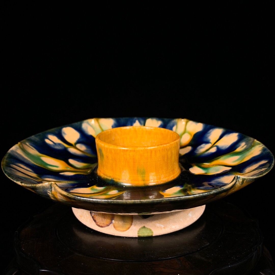 - 【超珍館蔵】唐 古陶瓷品 三彩 菱口盞托 置物 古賞物 古美術品 稀少珍蔵品