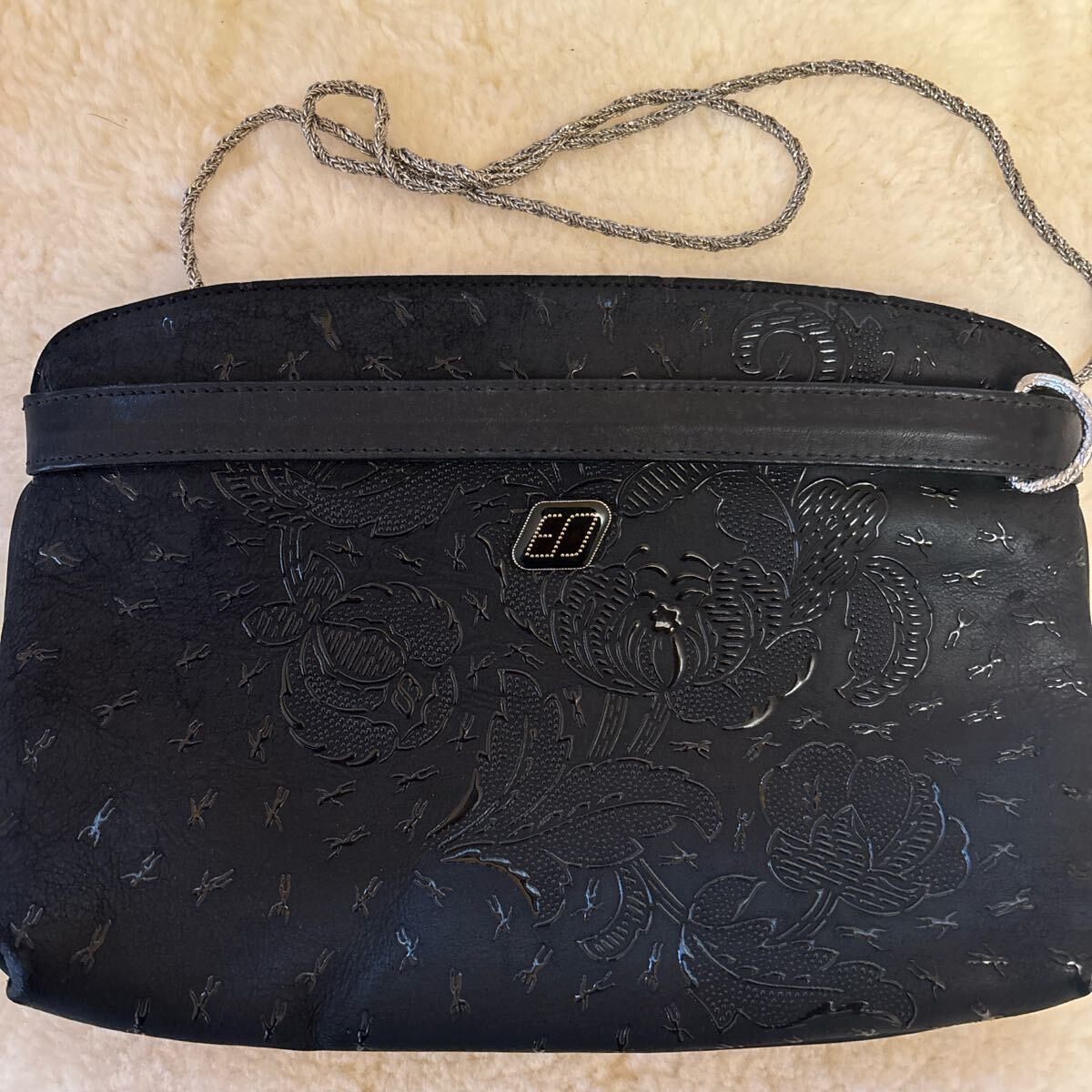 - ☆ 印伝屋 ショルダーバッグ ブラック 黒 花柄エンボス ショルダーバッグ チェーン