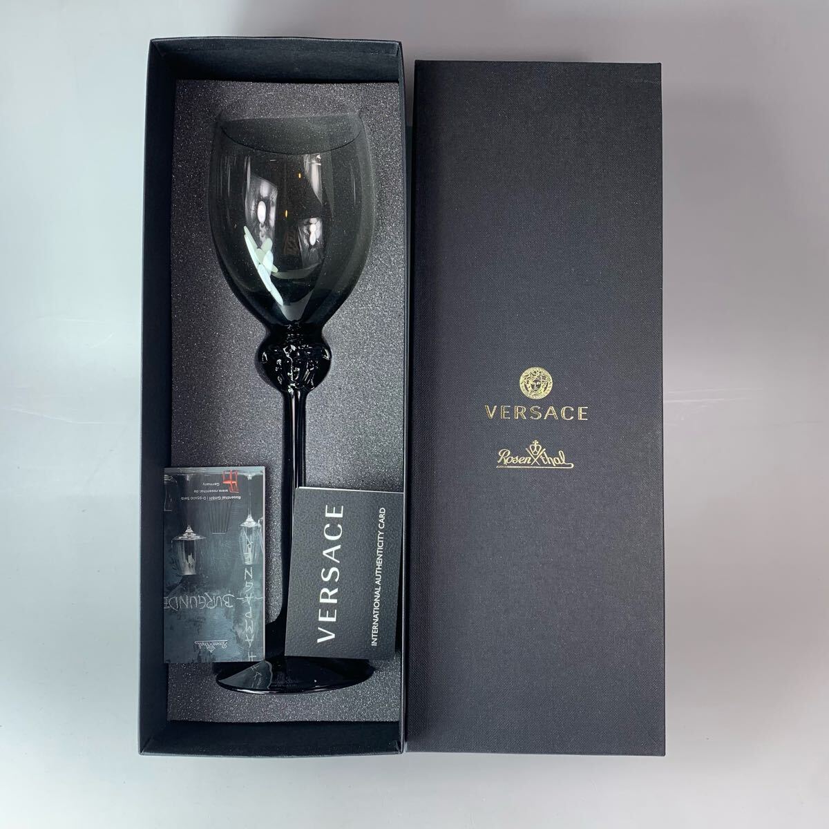 - 未使用保管品 ヴェルサーチェ Versace メドゥーサ リュミエール ヘイズ ゴブレット ワイングラス ブラック ベルサーチ 高級グラス 黒