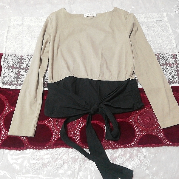 - アイボリーと黒腰ひもリボン綿100%チュニック Ivory and black ribbon waist string 100% cotton tunic