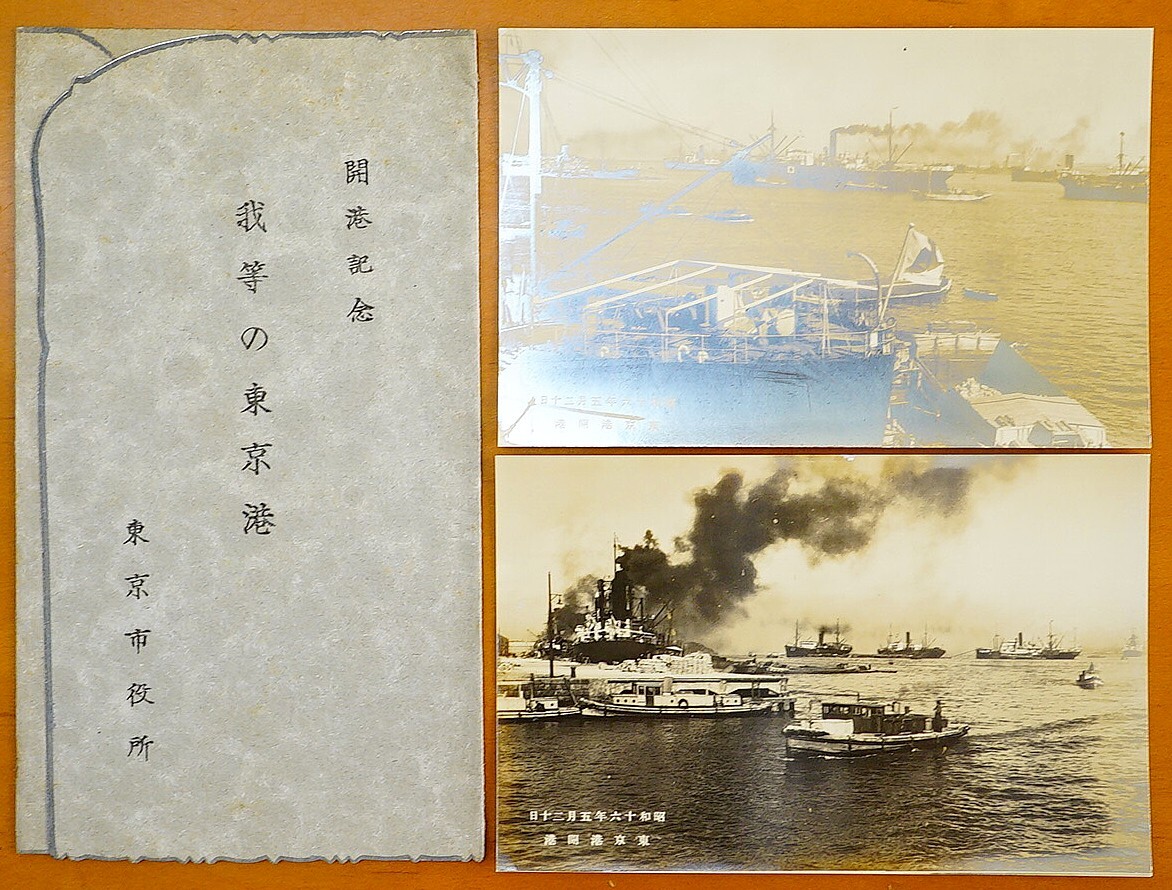 - 開港記念 我等の東京港 絵葉書2枚 東京市役所発行 ジーチーサン商会製 昭和16年 紙ケース付 検:国際貿易港 貨物船 船舶 日の出芝浦竹芝ふ頭
