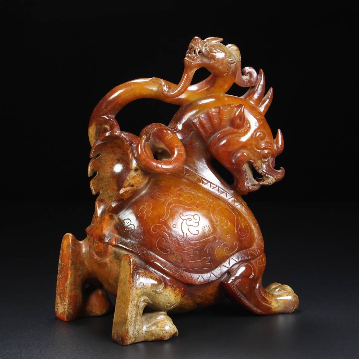 - ▽鴻▽ 和田玉製 細密彫 龍龜 置物 古賞物 中国古玩 中国古美術