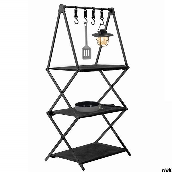 - 【収納サイズはコンパクトで、女性でも軽々持ち運び可能】アウトドアラック スライド式ハンガーフック付き 3段ラック コンパクト