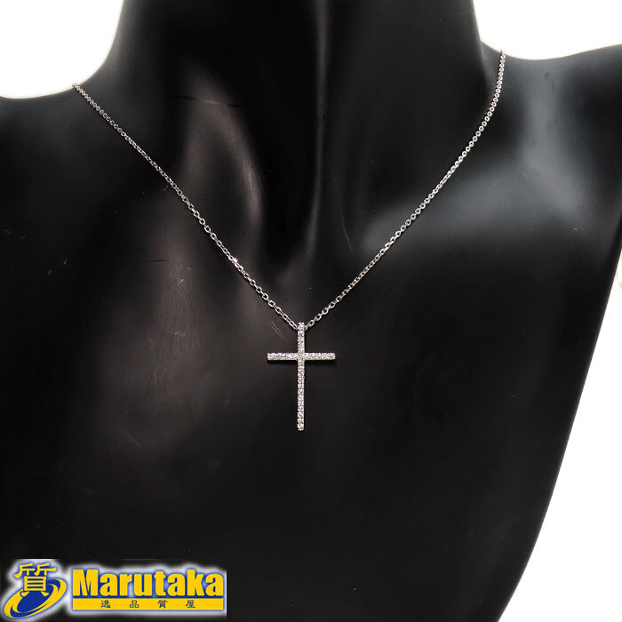 - 送料無料 K18WG クロス型 ダイヤモンド ネックレス 十字架 クロス 18金ホワイトゴールド 逸品質屋 丸高 23-37-5