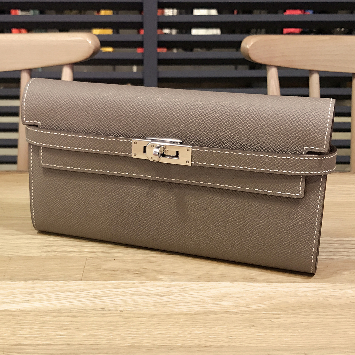 > 【超美品】エルメス ケリーウォレット ロング エプソン エトゥープ シルバー金具 D刻印 13694