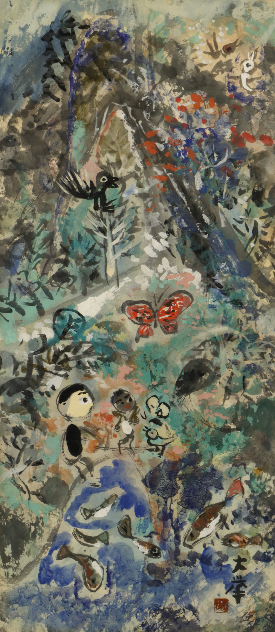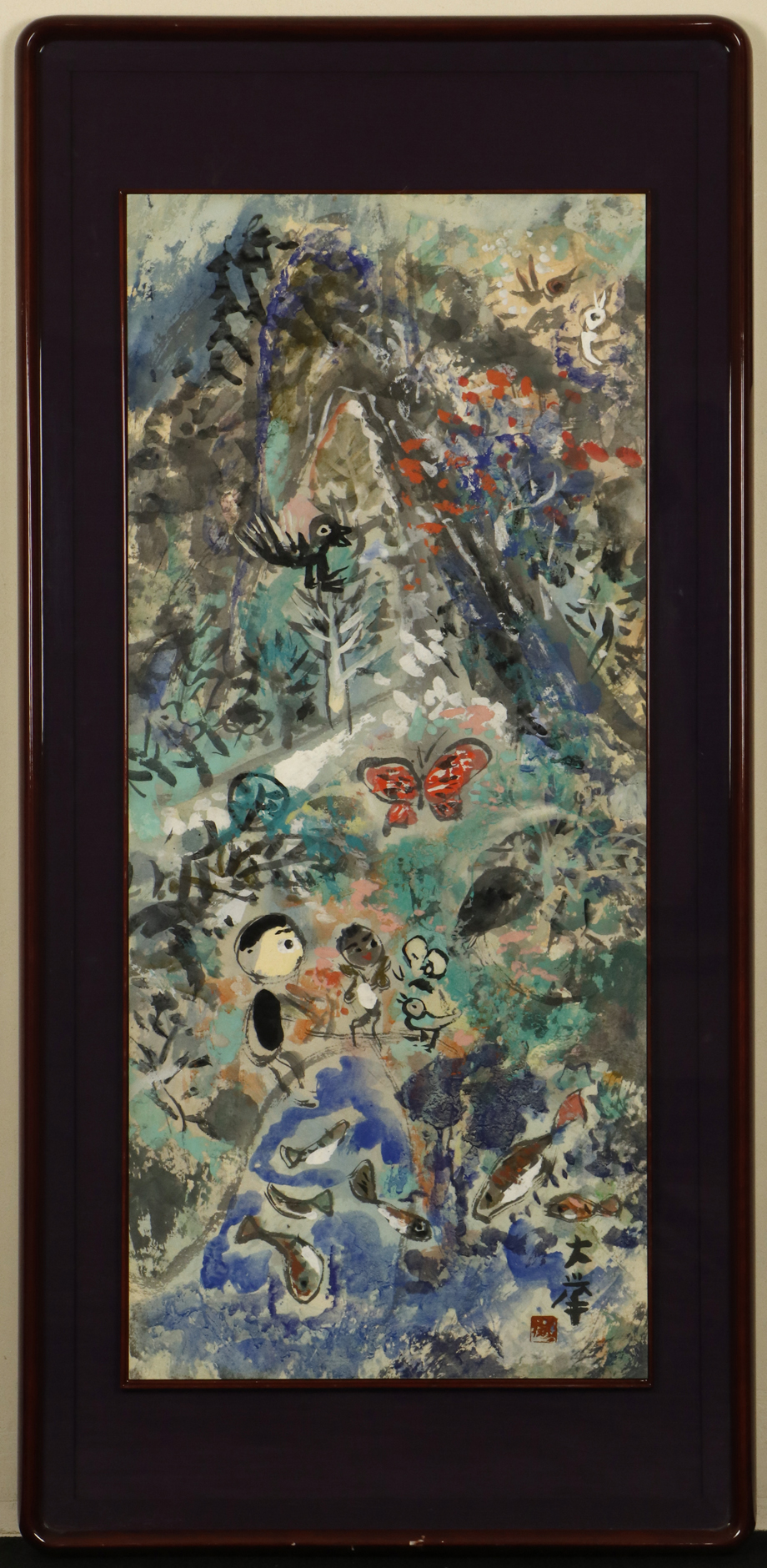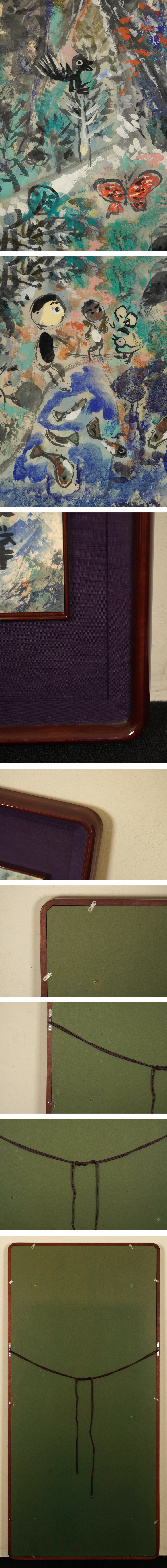 - 【真作】「丸投三代吉 山川児戯鳥蝶 額装」日本画家 大挙 姫路生 満州 シベリア抑留 絵画