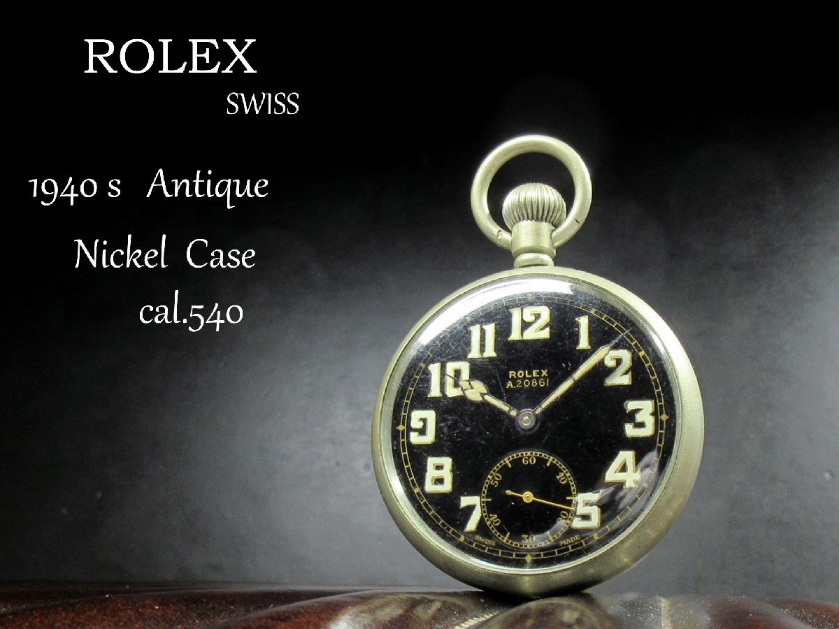 - 【ロレックス】1940年代 アンティーク イギリス軍用 ブラックアラビア文字盤 コブラ針 手巻 懐中時計 ニッケルケース R56