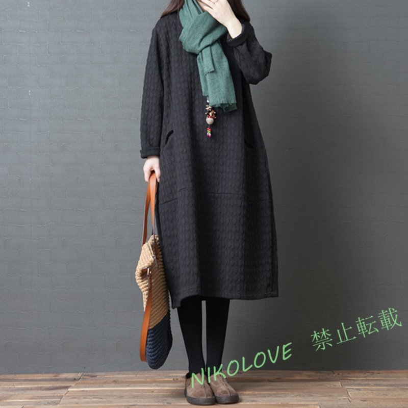 - 新品 ぽこぽこ素材があったかい 大きいサイズラウンドネックのロング丈長袖黒の定番ワンピ