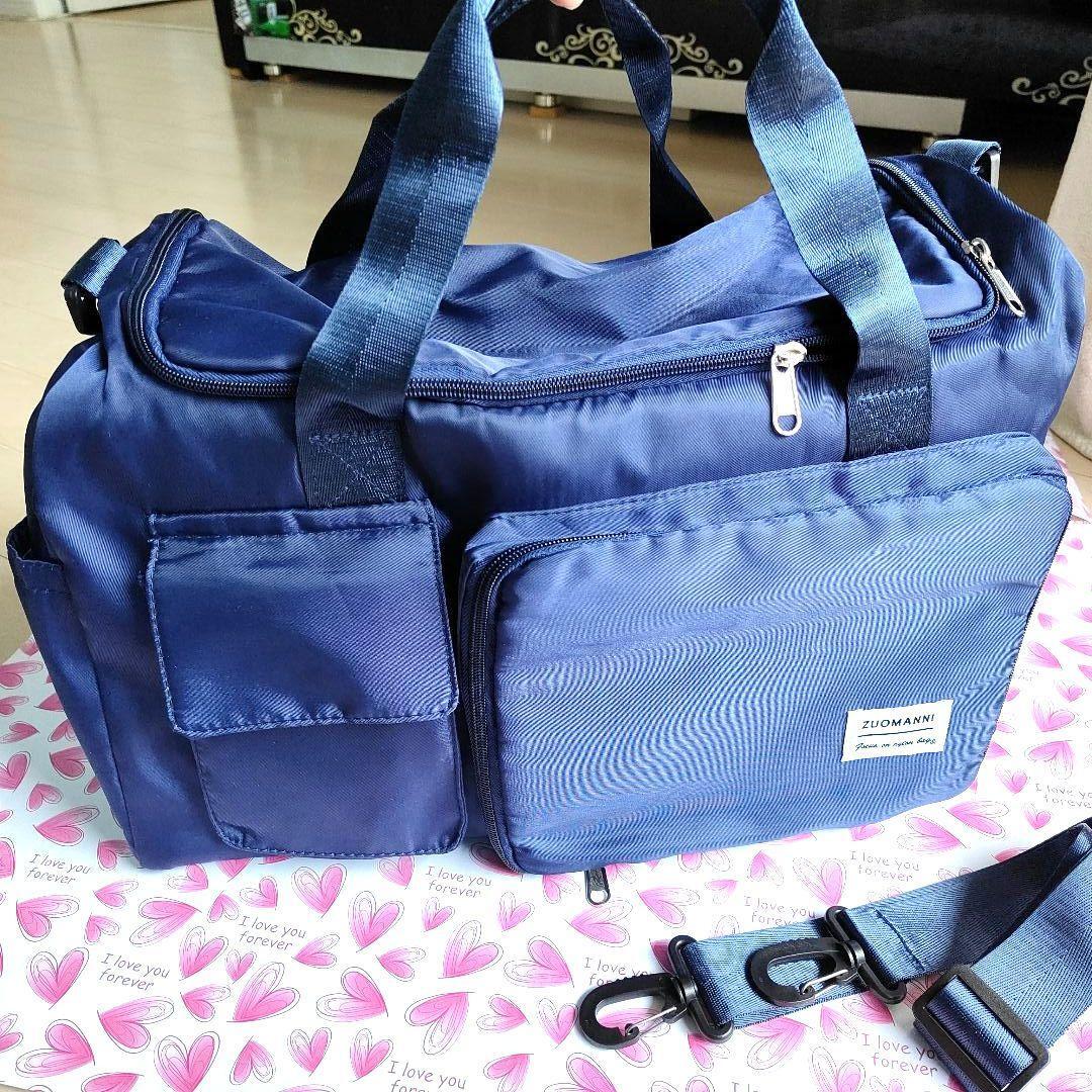 - トラベルバッグ 紺 折畳み サイド靴入れ コの字型開閉 ボストン ショルダー紐