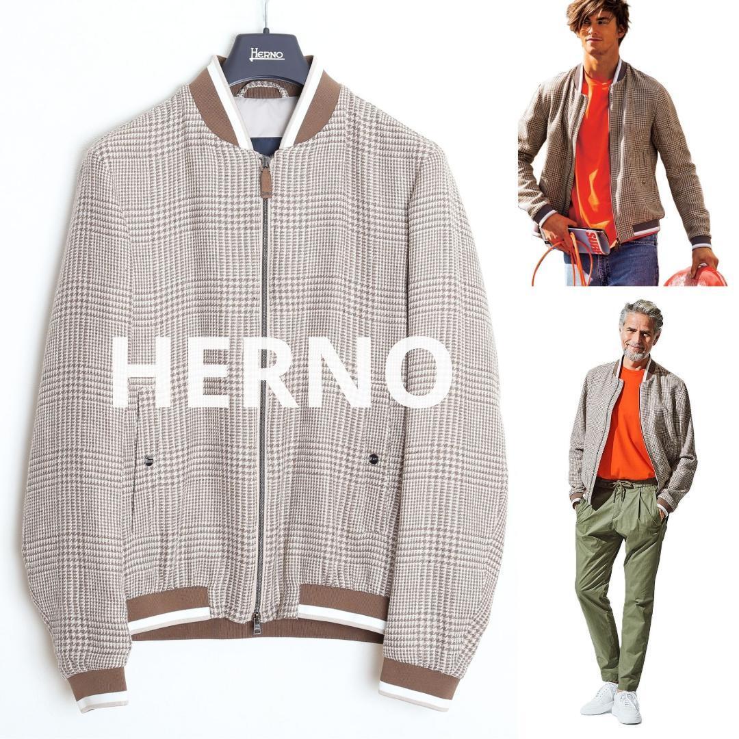 > HERNO 23SS 国内正規品 ツイードブルゾン 44 美品ジャケット ヘルノ ウール リネン シルク コットン千鳥柄グレンチェック スウィングトップ
