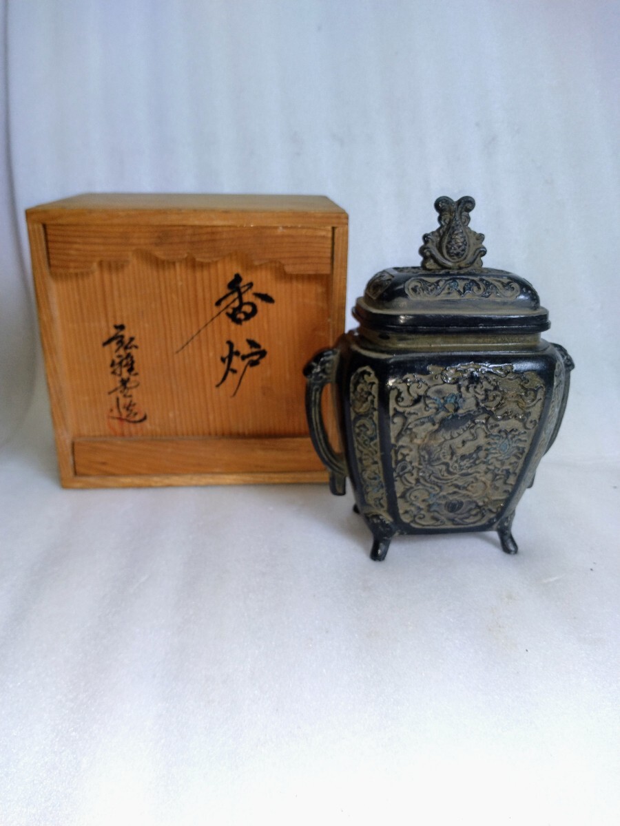 - K994 獣耳唐草 香炉 透かし火屋 象耳付 銅製 青銅 香道具 茶道具 四つ脚香炉 共箱 中古