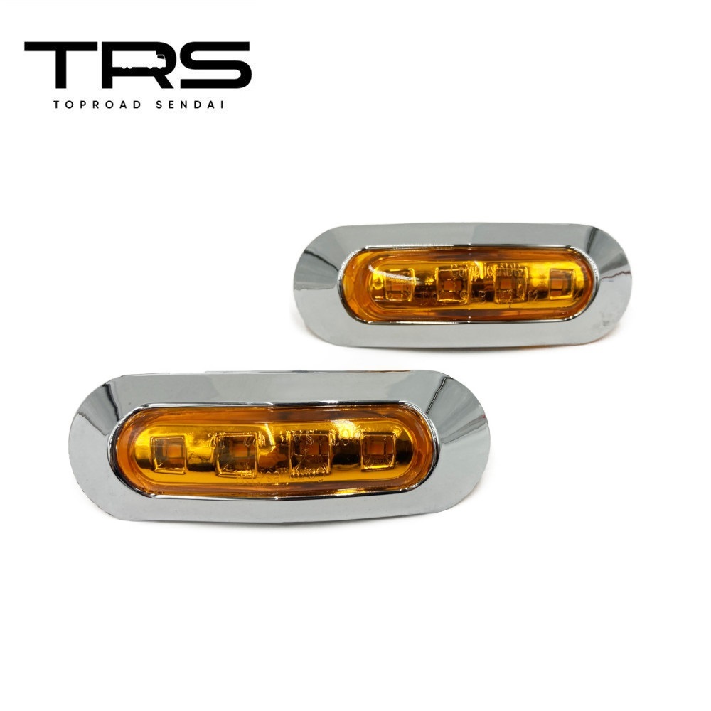 【商品名】TRS LEDサイドマーカー メッキカバー付 12/24V共用 2個セット アンバー 315173【商品説明】■メッキカバー付。スタイリッシュなデザインのサイドマーカー■コンパクトサイズなので様々な用途としてご利用頂けます。■12/24V共用なので幅広い車両に取付可能【各種仕様】■入数:2個セット■電圧:12V/24V共用 (10-30V)■材質:ABS■サイズ:直径95×幅33mm×高17mm(ネジピッチ 75mm)■付属:取付用ビス■注意事項※プラス線、マイナス線のみの常時点灯タイプとなります。※メッキカバー取り付けの際は両面テープや接着剤等で固定して下さい。※コーキング等で必ず防水処理をしてご使用ください。