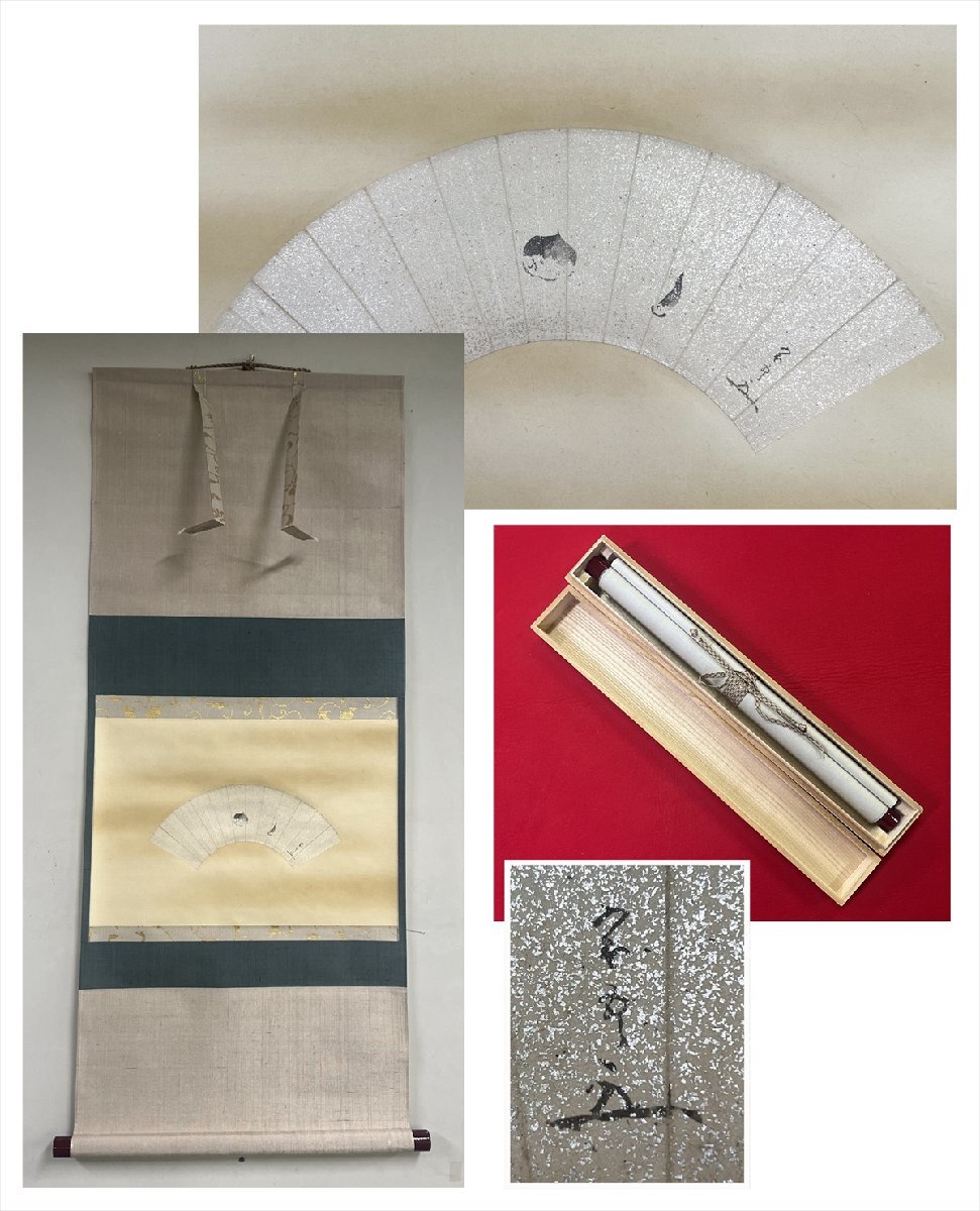 > 【千寿】松尾流 十代家元 松尾宗吾(不染斎)栗の絵 扇面 銀泊散し 横物 紙本 a434◆箱 茶道具 古美術 時代品 掛軸 100019185