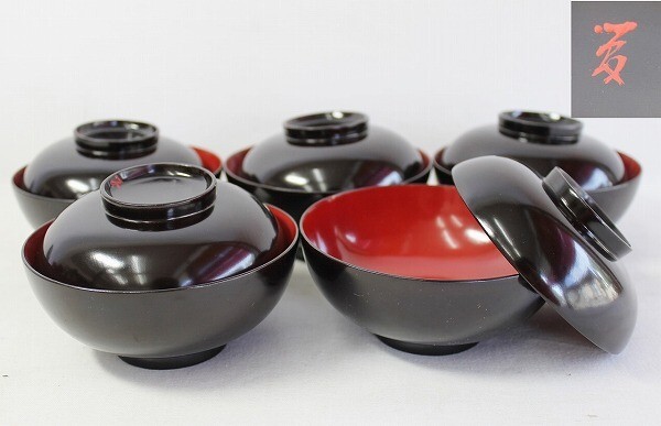 - 木製漆器 吸物椀 5客 外黒 内朱 蓋付 時代漆器 C222