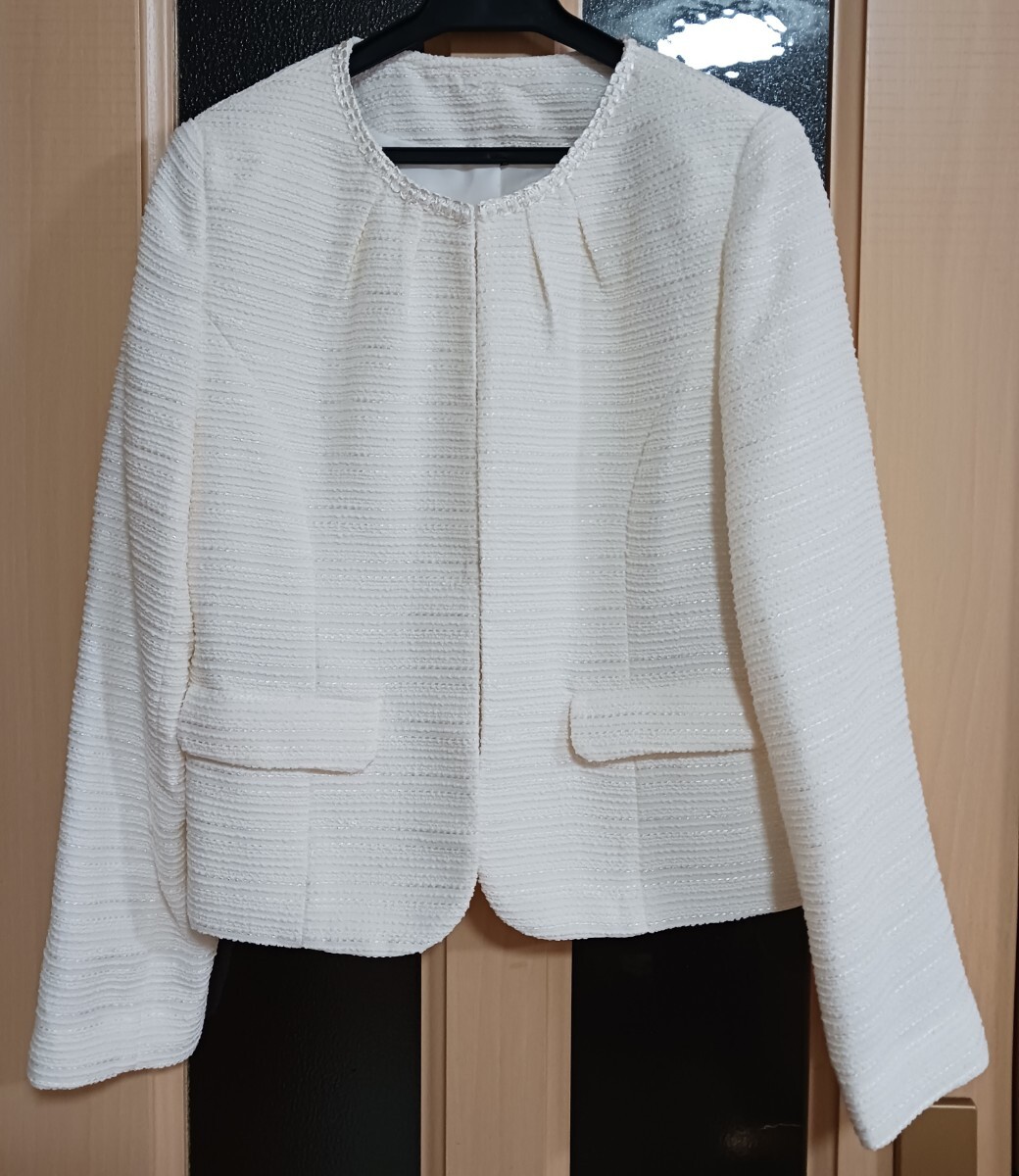 - 美品 白 ジャケット ホワイト 入学 ノーカラー 入園 卒業 食事会 ベージュ ポケットあり