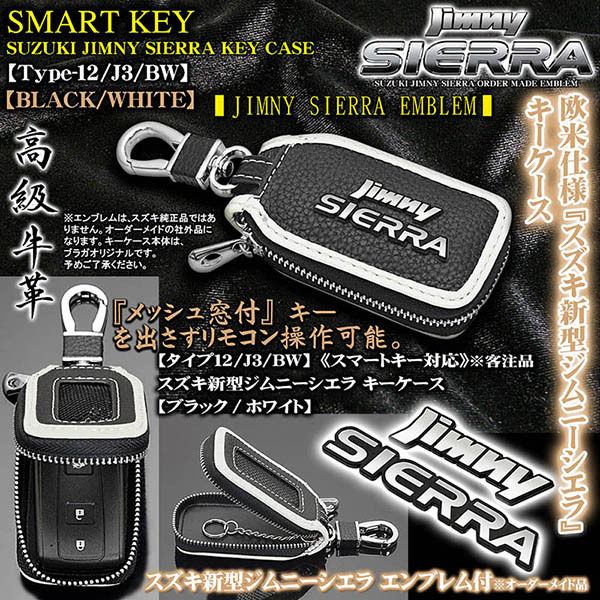 > タイプ12・J3/BW/スズキ 新型ジムニーシエラ エンブレム付/キーケース/ブラック・ホワイト/キーホルダー,窓付/スマートキー/牛革製/客注品