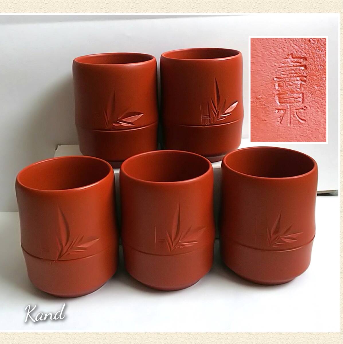 - 常滑焼★朱泥 湯呑み 竹 5点セット レトロ コレクションなどにも