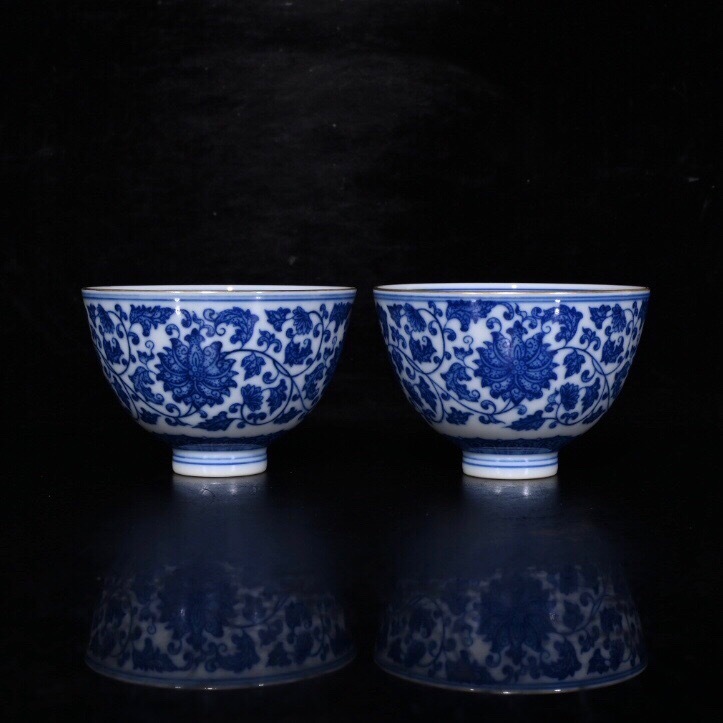 > 『館蔵珍品 清 乾隆年製款 古陶瓷品 青花 描金 纏枝蓮紋 供杯一對』置物 賞物 貴重物品 収蔵品 中国古美術