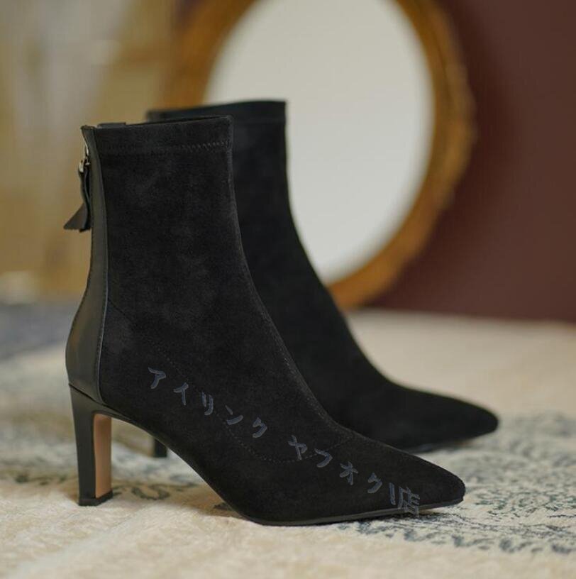 - レディース ショートブーツ スエード サイドゴア ピンヒール ポインテッドトゥ 高ヒールブーツ ブーティー 靴婦人靴美脚 お色選択可