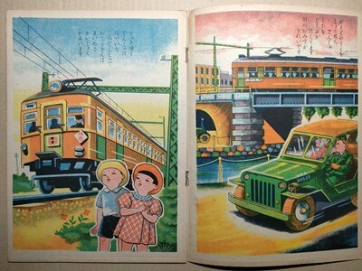 - t8古本【鉄道 児童書】昭和23年 絵本 西三郎 カゴメ玩具出版社(路面電車 大阪市営地下鉄100形? 国鉄クモハ40? MP乗車ジープ USAジープ 米兵