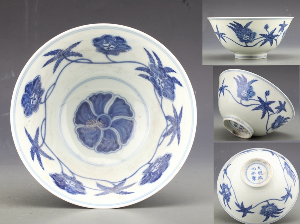 - 大明成化年制款 青花秋葵紋 茶碗 唐物 陶磁器 中国美術 古美術 置物