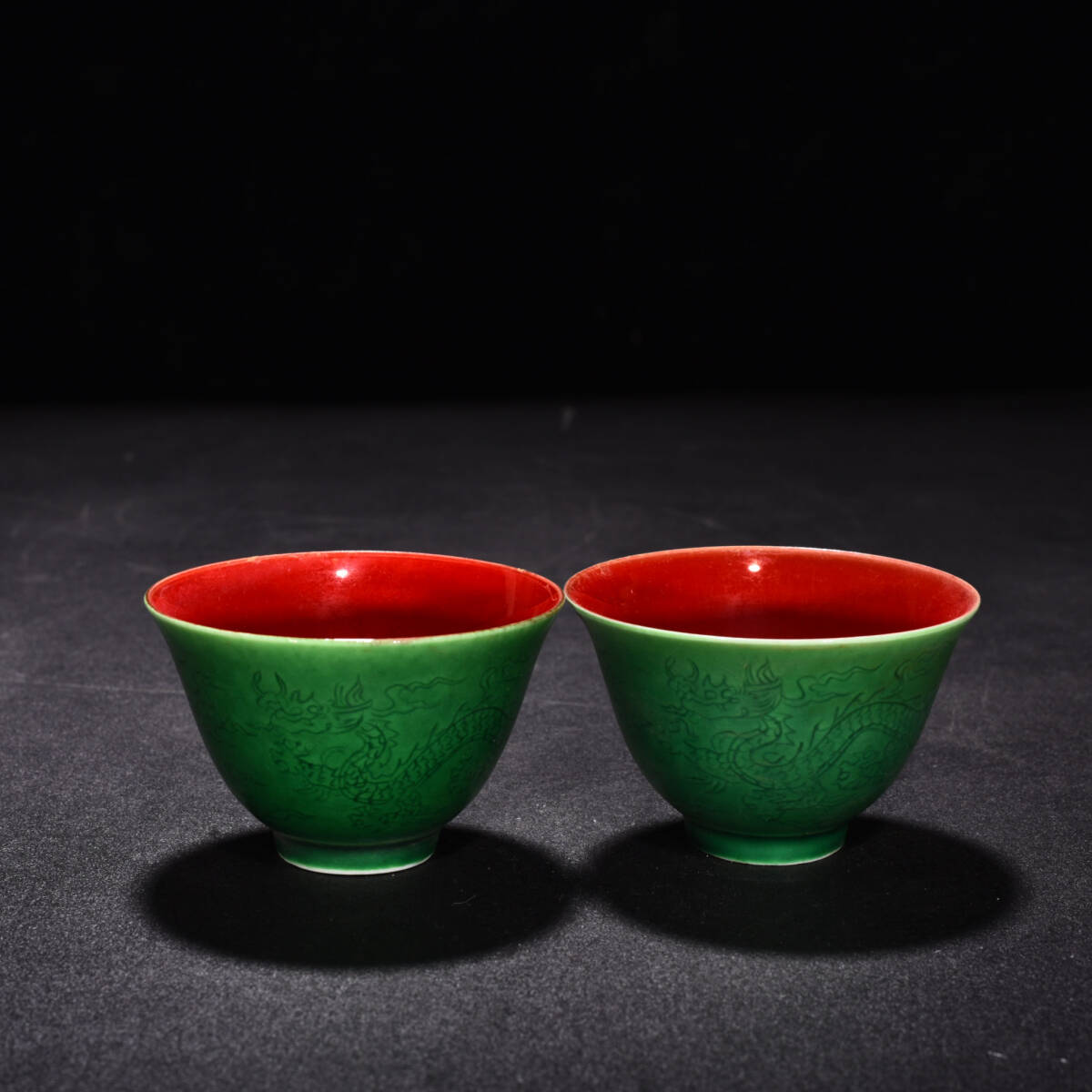 - TA101■中国古玩 唐物 大明成化年制款 緑釉刻龍紋内紅釉杯一対 時代物 極上品■